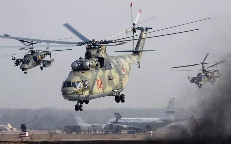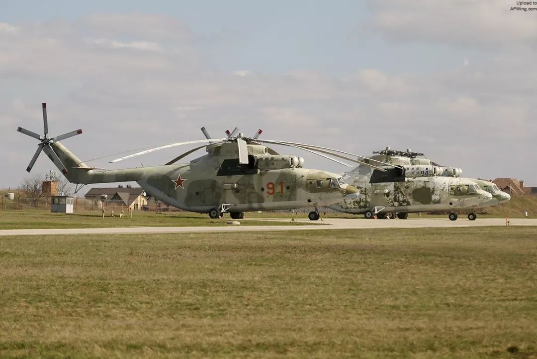在库宾卡空军基地与米-6A和米-24P停在一起的军用型米-26,注意其主起落架上方的突起即为干扰弹发射装置