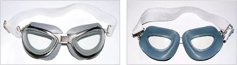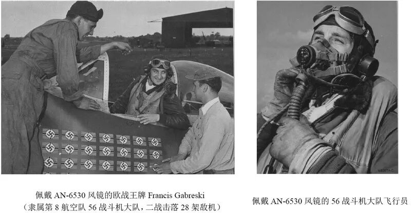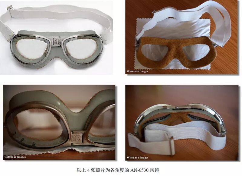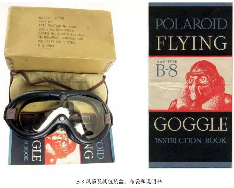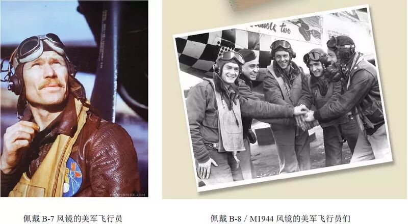 三、风镜 1、B-7风镜 二战美军的经典飞行风镜之一便是B-7,它1933年5月3日标准化列装,之后一直被使用到战争结束。其最大特征便是两块分离式的橡胶眼罩,风镜中央的金属框上印有“USAC GOGGLE TYPE B7”字样,全金属框架,镜片为玻璃,分透明、淡茶绿色等。 2、AN-6530风镜 在B-7风镜基础上改进而成,1943年标准化列装,被陆航和海航同时使用(AN其实是Army Navy的缩写),外形和B-7接近,也是全金属框架、玻璃镜片,顶部带有通气孔,整体做工和B-7一样精致,只是贴面的眼罩改成一体式的,除了橡胶外,还附有一层麓皮,配戴非常舒适,但是和B-7一样,最大缺点就是太重。 3、B-8和M1944风镜 为了提高产量、降低成本,直接导致B-8和M1944风镜的出现。两者外形几乎完全相同,由Polaroid宝丽莱公司生产,其整体为塑料和橡胶(带有一小部分金属加强片,B-8贴面部分带有一层麓皮),镜片为塑料,分透明、红色等几种,整体极为轻巧,视角开阔、而且耐用性一点不比B-7和AN-6530差。近代美军的军版防风、防尘镜和B-8/M1944 外形很像。两者在二战也被飞行员们大量使用。  B-7风镜正面和反面