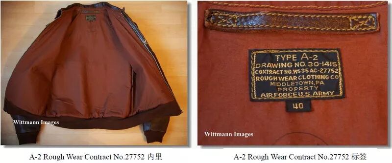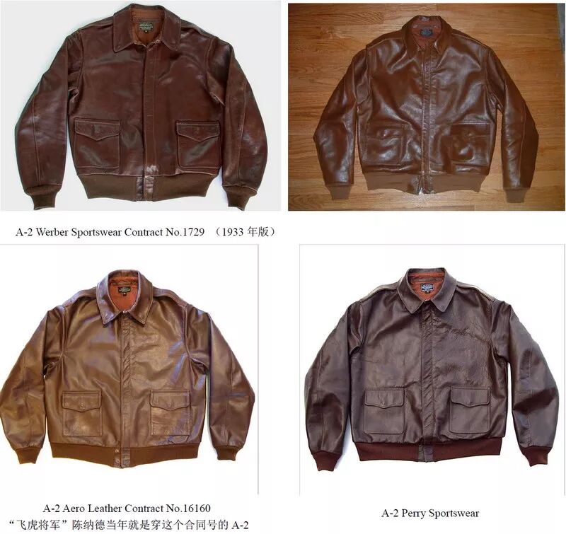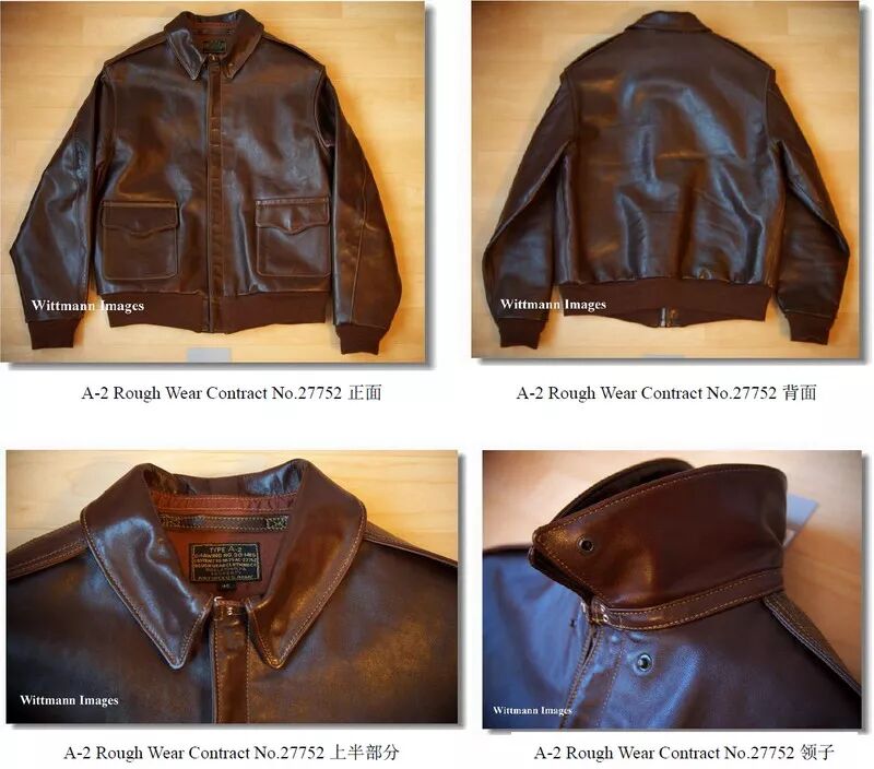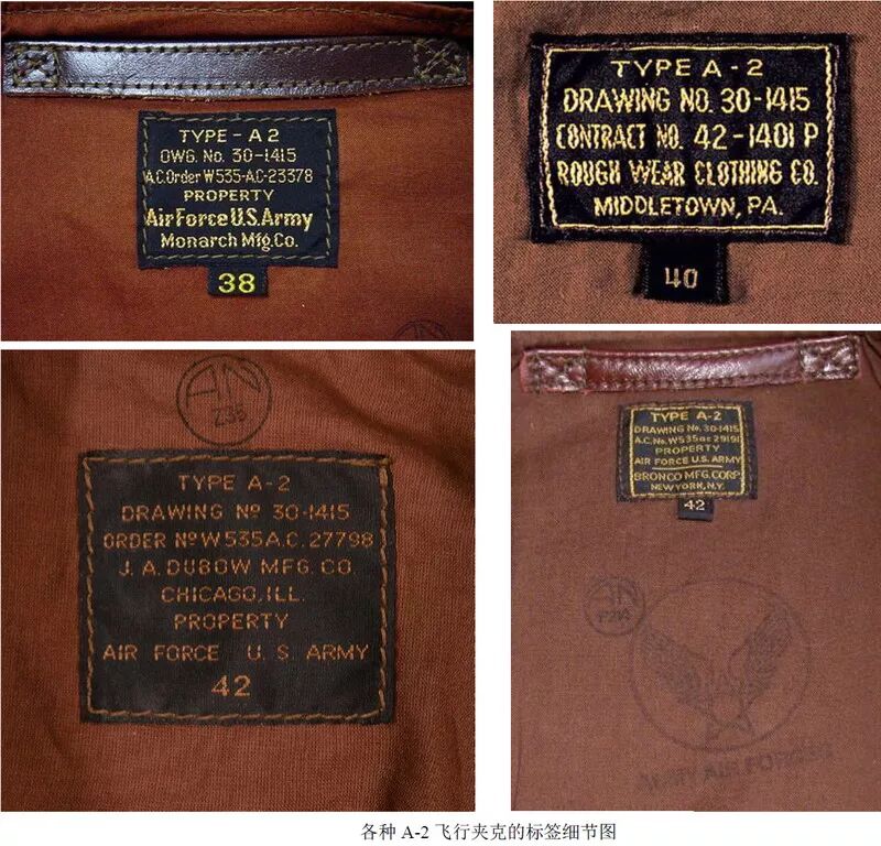 四、夹克服装类 1、经典的A-2飞行夹克 它的名气实在太大了,不用太多介绍几乎所有喜爱军事的朋友都知道。但是要详细介绍它的细节以及历史,恐怕用整本书的篇幅都不够,所以在这里也只能简单说一下。A-2飞行夹克1930年9月20日,其设计型号投入试用阶段,1931年5月9日开始进入正式使用阶段,其服装设计号码为31-1415,而不是夹克内部标签上显示的30-1415。美国陆军航空队的第13级目录(Illustrated Catalog Class 13)把A-2称为 “Jacket, Flying, Type A-2”(规格号码为94-3040)。至于材料方面描述为:“深棕色马皮,针织袖口和腰带”。尺寸经过修正后为:32至54号。A-2在二战拥有众多的生产商,比如下列这些: Aero Leather Clothing Co., Inc. Bronco Mfg. Co. Cable Raincoat Co. Cooper Sportswear Mfg. Co. David D. Doniger & Co. J.A. Dubow Mfg. Co. Monarch Mfg. Co. Perry Sportswear, Inc. Poughkeepsie Leather Coat Co., Inc. Rough Wear Clothing Co. Spiewak & Sons Star Sportswear United Sheeplined Clothing Co. Werber Sportswear 外形特征为:衬衫式样的领子、两个外贴式口袋(带有口袋盖片)、外部式风襟片、带有肩绊,以及针织袖口和腰带,简洁而经典。颜色一般为Seal Brown 深棕色和Russet偏铁锈红棕色。