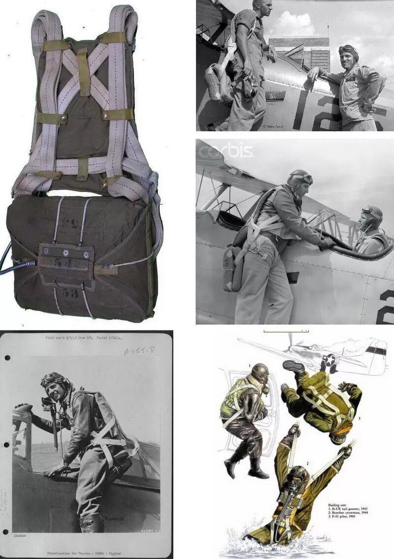 2、降落伞 二战美军飞行员常用的降落伞主要分为两种类型,Back-Type和Seat-Type,也就是后背式和坐垫式。这里主要介绍一下后者。它的背负系统对飞行员的影响较小,伞包可以直接挂在臀部。进入飞机座舱后,伞包和背负系统臀部的垫子可以成为座椅的一部分,驾驶飞机时戴着比较舒适,不会像后背式降落伞那样造成很大的不舒适性。经典的坐垫式降落伞有AN-6510,陆航和海航通用。