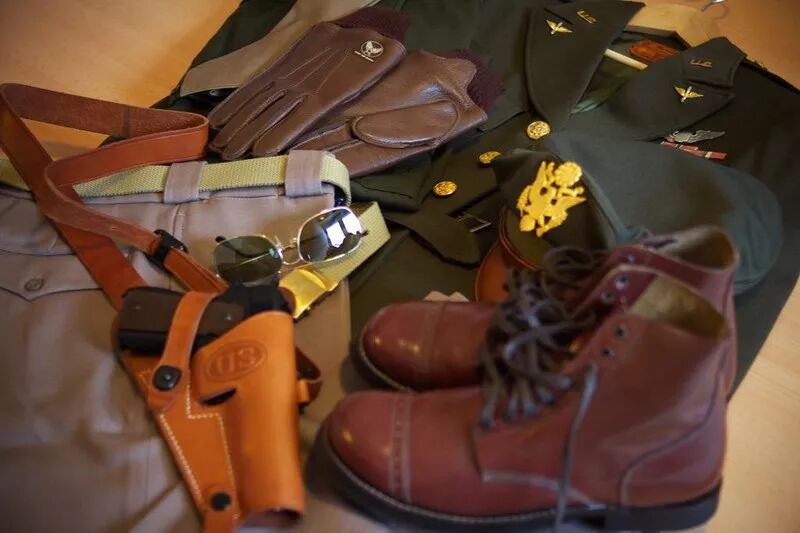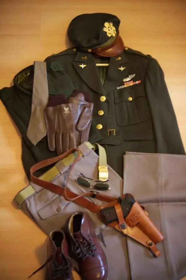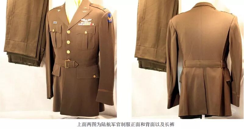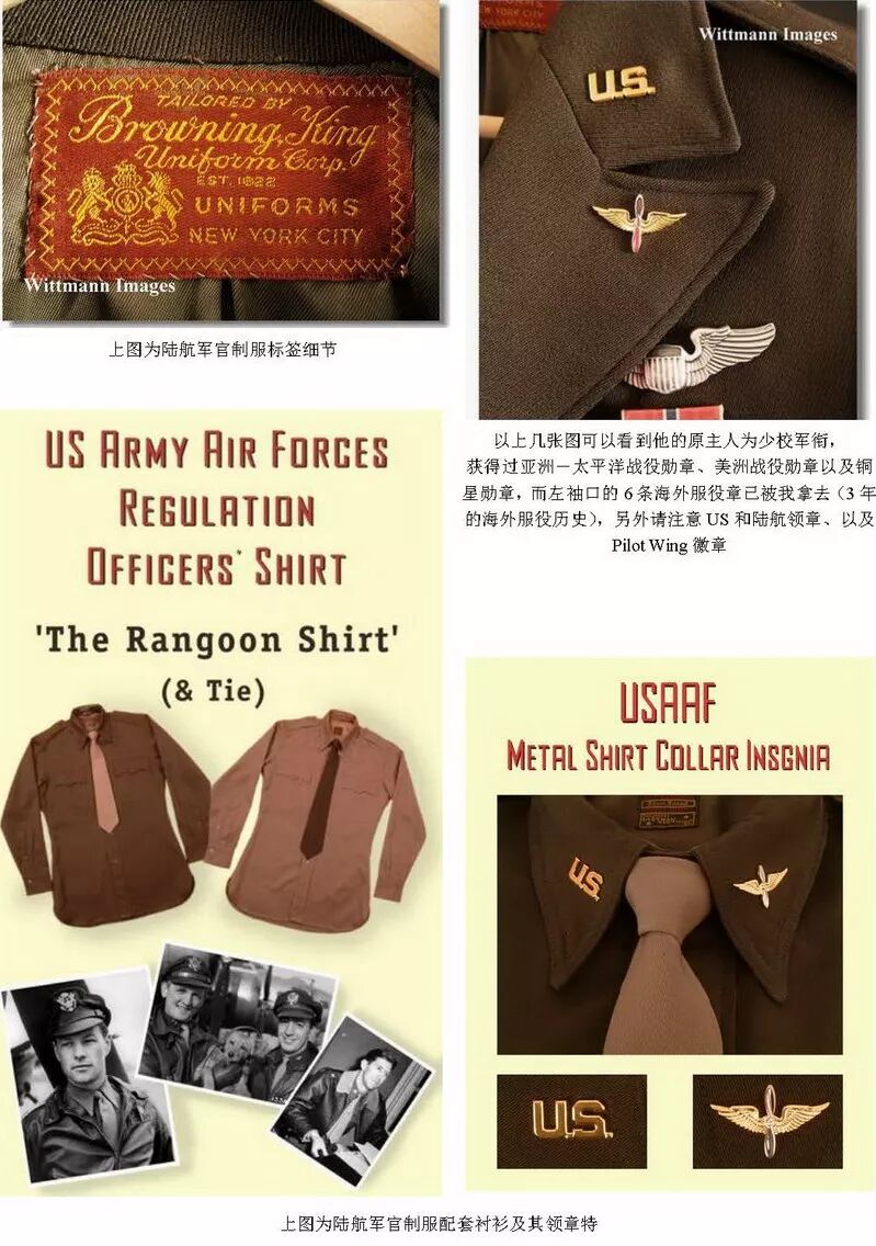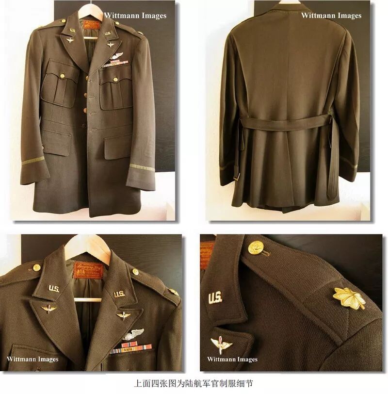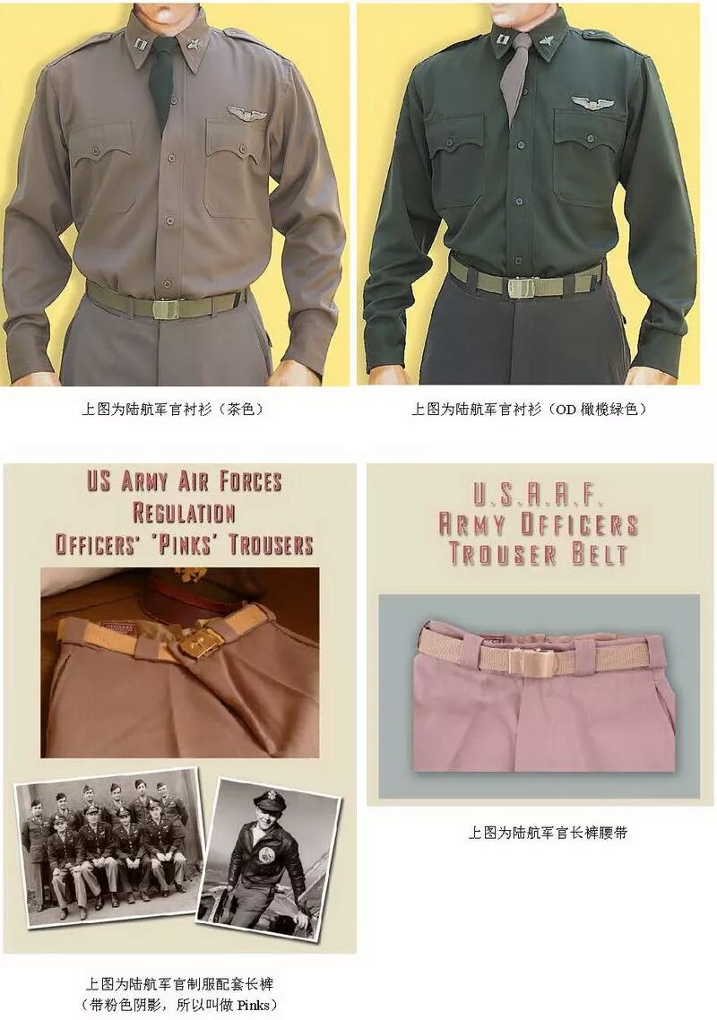 4、军官制服、衬衫和长裤等 陆军航空队军官制服(Service Uniform / Tunic No.1)和陆军完全一样,只是上面的徽章等有些区别。其颜色通常为第51号OD深橄榄绿色(No.51 olive drab),外表材质通常为100%羊毛,内里一般为光滑的缎子(Satin或者Rayon)。配合同样为OD色的100%羊毛军官衬衫(此时配茶色领带)和茶色制服长裤(有时带有咖啡色或者微粉色阴影)配套穿着,也被叫做Pinks&Greens。至于长裤上通常系卡其色编织物腰带,腰带头由光滑的铜片制成,有时候上面会刻有陆航的带翅膀的螺旋桨图案。最后再配上军官大檐帽Crusher Cap或者Service Cap。