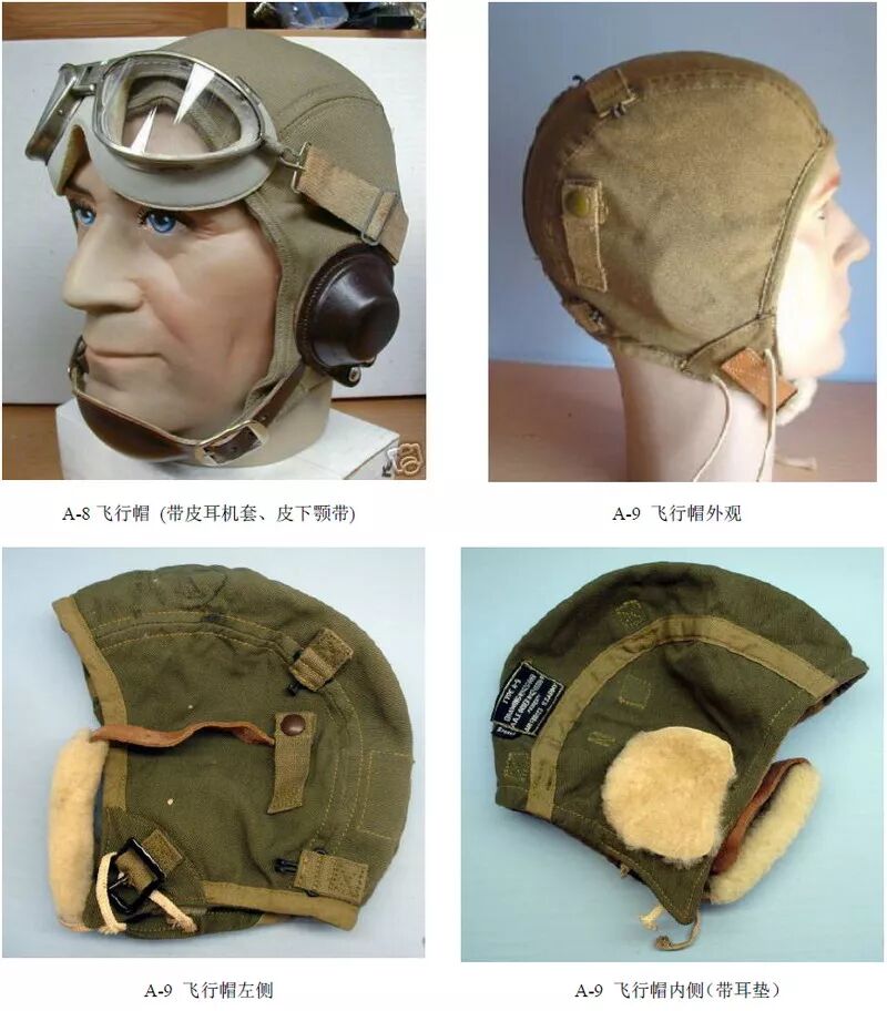 4、A-8和A-9夏季飞行帽 A-8飞行帽1933年5月3日标准化列装,1941年3月24日被有限列装,由茶色布料制成,最大特征是带有面部的松紧绳用来调节松紧度,帽体上有钩子用来固定A-9或者是A-10氧气面罩。通常它还带有固定在喉部的带绒毛的下颚带,部分版本带有直接固定在下颚的皮质固定带和用于安装耳机的皮质耳机套。它适合热带、炎热地区或者夏季使用。 A-9飞行帽1941年12月24日标准化列装,其外形和A-8飞行帽几乎完全相同,之后逐步取代了A-8。