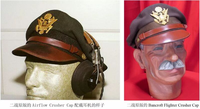 一、帽类 1、Crusher Cap军官大檐软帽 最初只是和制服配套穿着的大檐帽,内部带有固定帽体部分的刚性加强条,而且帽檐也无法弯曲。后来由于(轰炸机)飞行员在飞行过程中戴着大檐帽的同时无法配戴头戴式耳机,因此他们自行拆除帽圈加强条,并且使帽檐变柔软,以便同时配戴耳机。这种改装的大檐软帽经常戴上耳机后,帽体部分外形塌陷,但是更符合飞行员的头形,因此叫做“Crusher Cap”。后来生产商按照这一需求直接生产了Crusher Cap,不需要飞行员们自己改动就可以配戴耳机,并且需要的时候帽子还可以卷起来塞入口袋。一些著名的生产商包括Bancroft Flighter、Luxenberg、Flight Weight、Lewis Fly-Weighter、Lee-Flight、Airflow等,颜色主要为Olive Drab (暗橄榄绿)或者Tan(茶色、接近米黄色,适合热带地区使用),帽体材料一般为100%的羊毛,汗带和帽檐全皮。著名二战题材连续剧《Hogan’s Heroes》里的男主角就一直配戴着这种帽子。