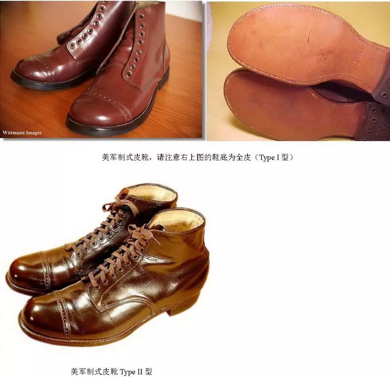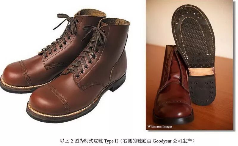 六、鞋类 1、美军制式皮靴 Service Shoes Type I/II 也叫Ankle Boots,鞋头带有toe cup皮质鞋头杯,二战美国大兵以及军官大量使用,同样包括美军的飞行人员。Type I为全皮鞋底,耐磨性很差,而Type II改进为复合鞋底,以提高耐磨性和防水性。