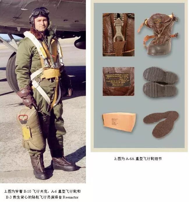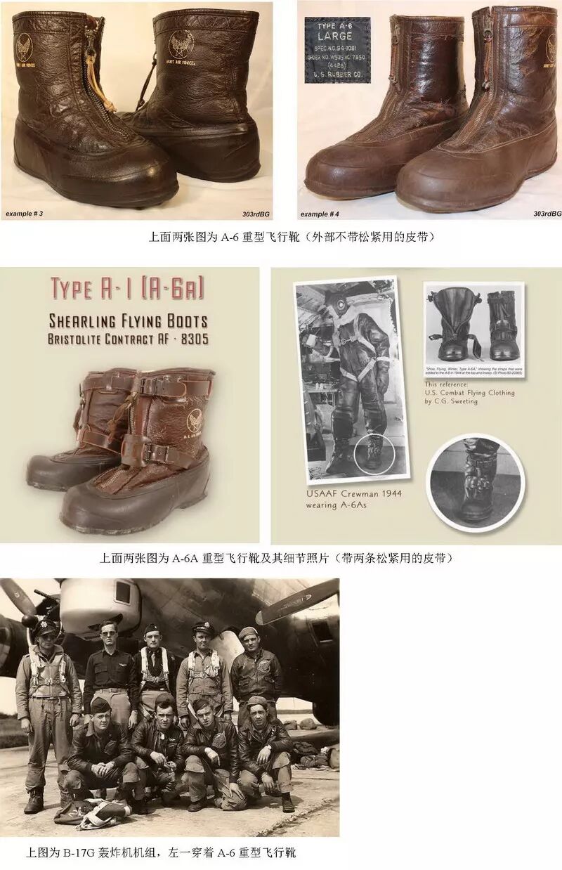 2、A-6重型绵羊皮飞行靴 A-6重型绵羊皮飞行靴1937年3月27日标准化列装,用于美军的高空轰炸机机组在极低温状况下使用,鞋底为全橡胶制成,鞋周围也用橡胶加固。由于该靴巨大,内部还可以穿上正常的鞋子或者保暖内套,用于提高抗寒性。一些二战图片或者影片中经常可以见到身穿 B-3飞行夹克(里面还穿着E系列的电加热飞行服)和A-3飞行皮裤,以及A-6飞行靴的美军轰炸机飞行员。虽然样子臃肿,但是对于经常在2.2万英尺飞行的机组来说,尤其对位于非加压机舱内的轰炸机机枪手来说,还是很有必要的,因为那里的气温只有-40~-50摄氏度。1944年A-6飞行靴得到改进,增加了两条用于调节松紧的皮带,型号变成了A-6A。到50年代早期,它被重新编号为A-1飞行靴。