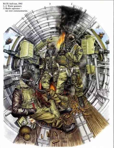 B-17轰炸机机舱内的腰部机枪手和无线电操作员(躺下者)彩画