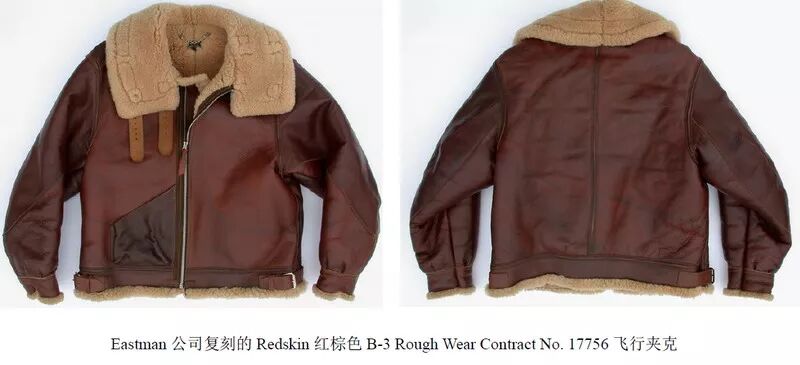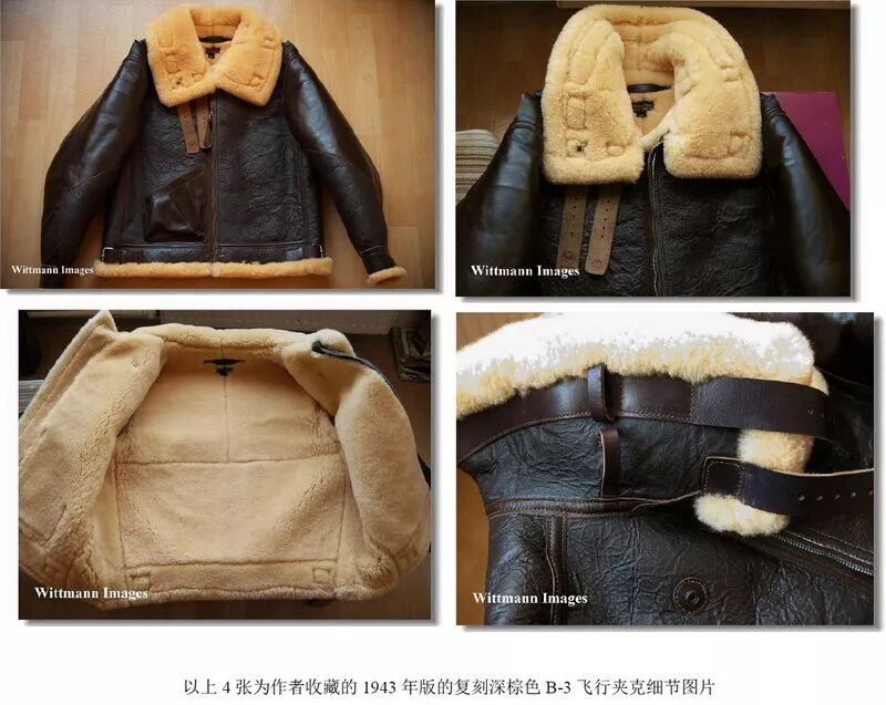 2、B-3冬季飞行夹克 1934年5月8日标准化列装,属于Heavy Zone系列,适用于-10~-30摄氏度范围,袖子由3/4英寸厚,身体部分由1-1/4英寸厚的带毛绵羊皮制成,肘部用马皮加强(部分合同商还曾经用过山羊皮加强肘部),只有右侧一个小的地图袋,腰部和颈部都有皮带可以调整松紧度,肩部有两个很小的肩绊(大约2英寸见方),用来缝制军衔标志,同时又为了避免跳伞时降落伞绳缠绕在上面,是二战美国陆航又一经典的飞行夹克,甚至连二战Luftwaffe德国空军飞行员也想方设法通过非正常渠道获得。其规格号为Spec No. 3061,制图号为Drawing No. 33H5595。B-3的生产商很多,除了著名的Rough Wear、Aero Leather以外,还有HLB Corp、Werber Sportswear、Perry Sportswear等。 至于保暖性,今年1月初当地零下25度,终于有机会穿B-3试验一下,里面只穿了一件羊毛衫,外面罩着这件B-3,保暖性特别好(在室外连续呆了2小时),像裹着羊毛被子,不过B-3太短,对头部和臀部的保护有限(配上B-2冬季飞行帽以及配套的A-3皮裤会好很多),所以还是感觉N-3B Parka或者B-7绵羊皮极地Parka(带兜帽)在极端低温下保暖性更好。