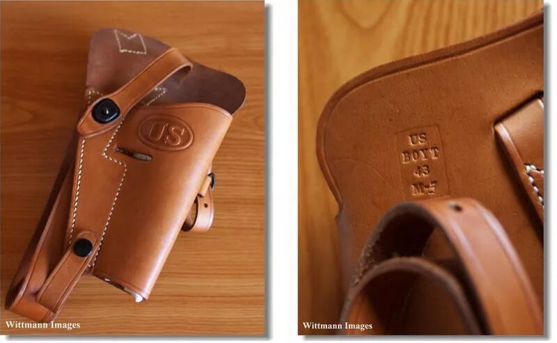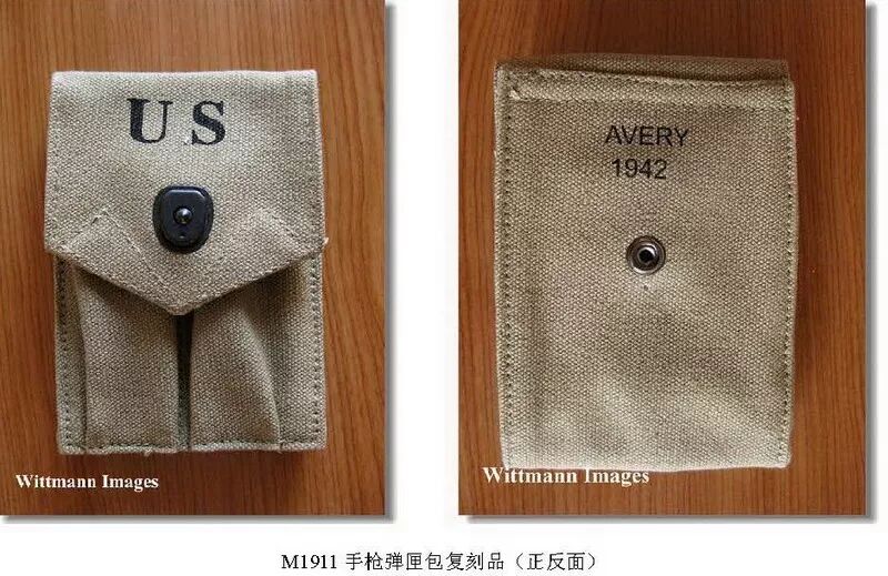 八、其他装备 1、M-3 手枪肩套和弹匣包 飞行员执行飞行任务时通常都携带手枪作为自卫武器,这其中.45口径的Colt M1911A1最为普遍。M-3便是专门为Colt M1911A1所设计,可以斜挎在肩上,采用厚牛皮制成,生产商主要有Enger Kress、Boyt等。  作者收藏的M-3手枪肩套复刻品照片及其背面