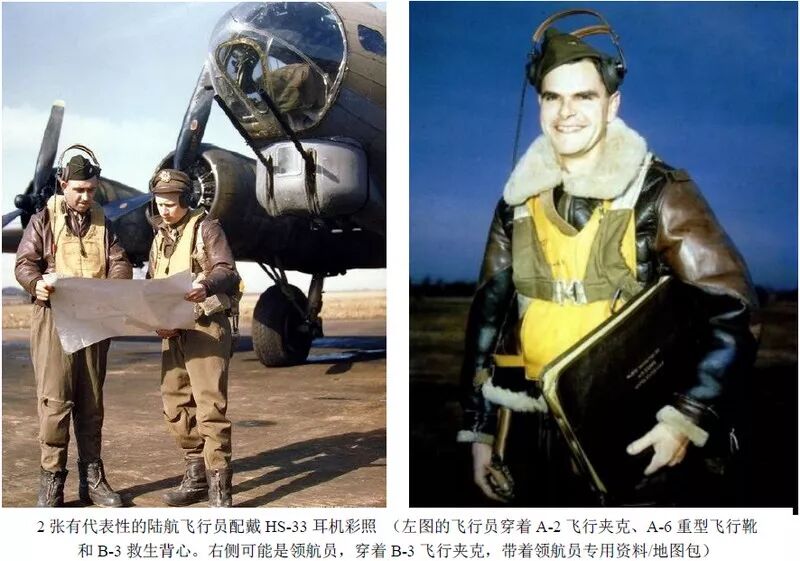 二、耳机 二战陆航大量使用HS-33和HS-18头戴式耳机。两者的耳机支架型号都为HB-7,前者的耳机本体型号为ANB-H-1、耳机接口为PL-354(红色),后者耳机本体为R-14,接口为PL-54(黑色)。它们通常配戴在Crusher Cap或者B-2冬季飞行帽上,有时候耳机本体也可以拆下单独放入飞行帽的皮质耳机套中使用。
