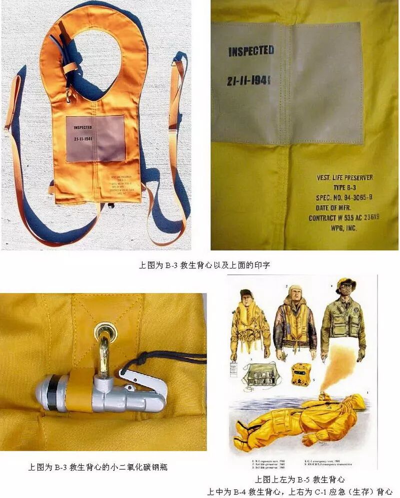 七、救生、防护制品 1、B-3救生背心 在二战影片中,B-3救生背心同样属于曝光率很高的一件装备(虽然 B-4、B-5救生背心后期也经常使用)。不论是美军的飞行员,还是美军空降师伞兵,几乎全都离不开它。在美军中它的绰号为“Mae West”(一位二战中著名的美国女影星,以丰满著称:-)B-3救生背心上有一个小二氧化碳钢瓶,飞行员落水后只需要拉一下上面的绳索就可以释放二氧化碳来充满救生背心。紧急情况还可以用嘴直接对着上面的充气嘴充气。通常飞行员们把救生背心套在飞行夹克外,然后再套上降落伞背带。