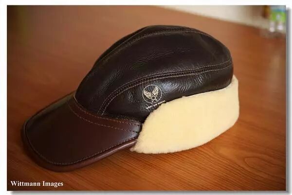 2、B-2冬季飞行帽 1939年4月21日标准化列装,帽体由1/4英寸厚的带毛绵羊皮制成,帽檐部分通常由马皮制成,必要的时候护耳部分可以翻下保护耳朵。大家经常可以在一些战争影片中见到它,比如《孟菲斯美女》等。通常轰炸机机枪手配戴较多。它一般与经典的B-3/B-6冬季飞行夹克配套使用。  上图左二和右边4位B-24轰炸机机组都戴着B-2 Cap