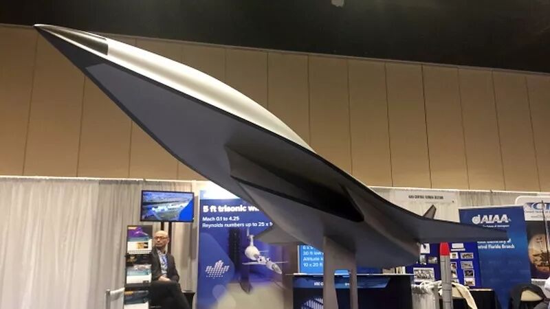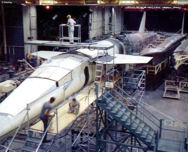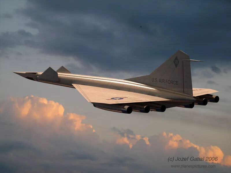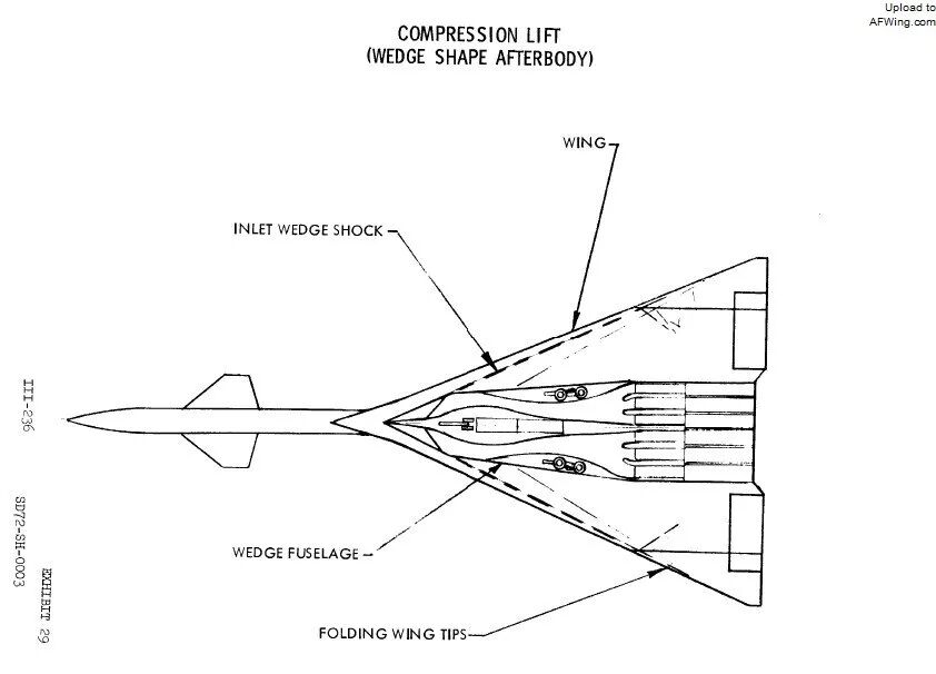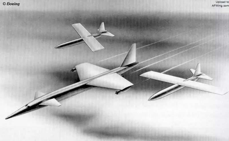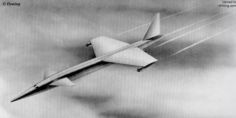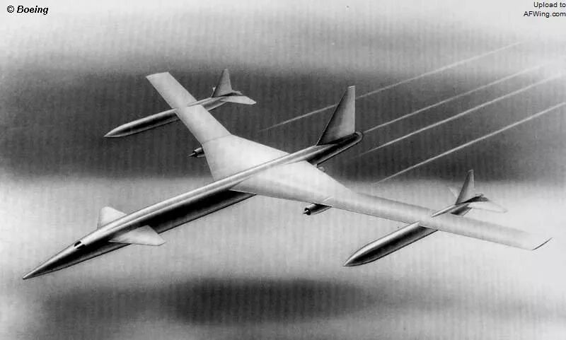 乘波飞行 到1957年,两家制造商完成了最终设计,波音公司的Model 804-4最终败给了北美的NA-278。波音采用其惯用的翼下吊舱式发动机,北美则把发动机置于机身内部,并依靠刚刚建立的“压缩升力”理论来帮助克服超音速阻力,从而增加飞机航程,这就是所谓的乘波飞行。  波音Model 804-4概念图