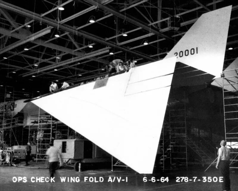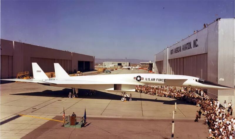 第一架XB-70 62-0001 AV1在1964年5月11日下线,其闪闪发光的白色耐热涂料在阳光下熠熠生辉。作为世界上最重、最快、最强大、最昂贵的多发轰炸机,该机于9月21日首飞。尽管经过了仔细的地面测试,但该机在首飞中主起落架拒绝完全收回,导致飞行员阿尔·怀特和乔·卡腾不得不放弃在首飞中进行超音速飞行的计划,并前往加州爱德华兹空军基地紧急降落。在降落中由于刹车锁死,起落架开始起火。  1964年5月11日,首架XB-70A原型机在北美航空公司设在加利福尼亚州帕姆代尔的第42号工厂中正式下线,照片所示为当天的场景