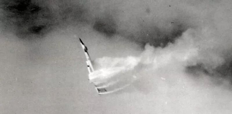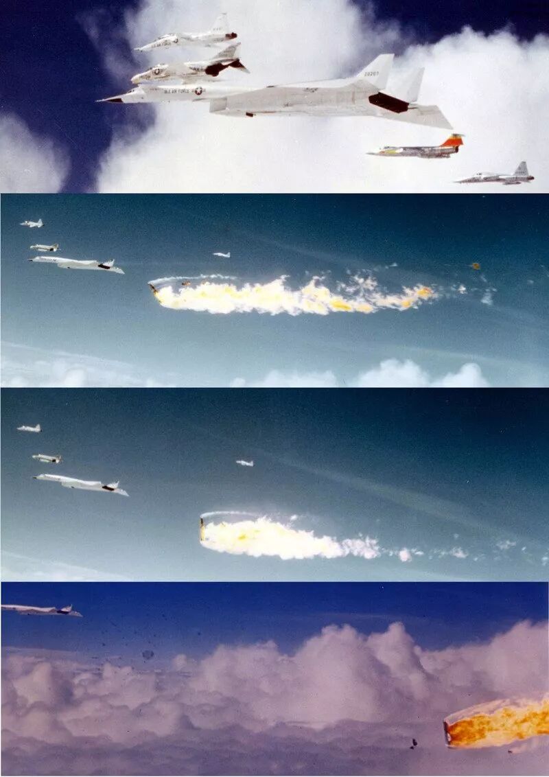XB-70与F-104N发生碰撞时实时拍摄下的照片,可见F-104N凌空爆炸,XB-70的垂直尾翼也被撞得粉碎