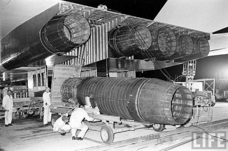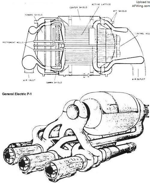 由于当时还没有合适的涡喷发动机,所以美国空军对两种动力方案进行了研究。其中第一种是丧心病狂的核动力方案,通过机载核反应堆来加热穿过涡喷发动机的空气,产生足以推动204吨重量轰炸机的超音速推力。核动力轰炸机项目被称为武器系统125A(WS-125A),通用电气公司与康维尔组队,普拉特·惠特尼公司与洛克希德组队参与了竞争。  通用电气设计的P-1型核涡喷发动机设计图,为直循环系统