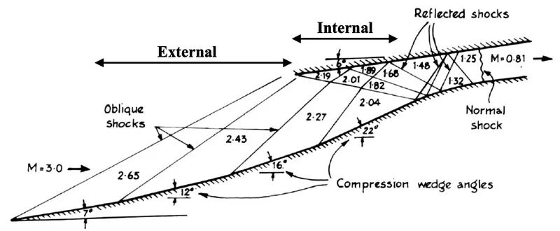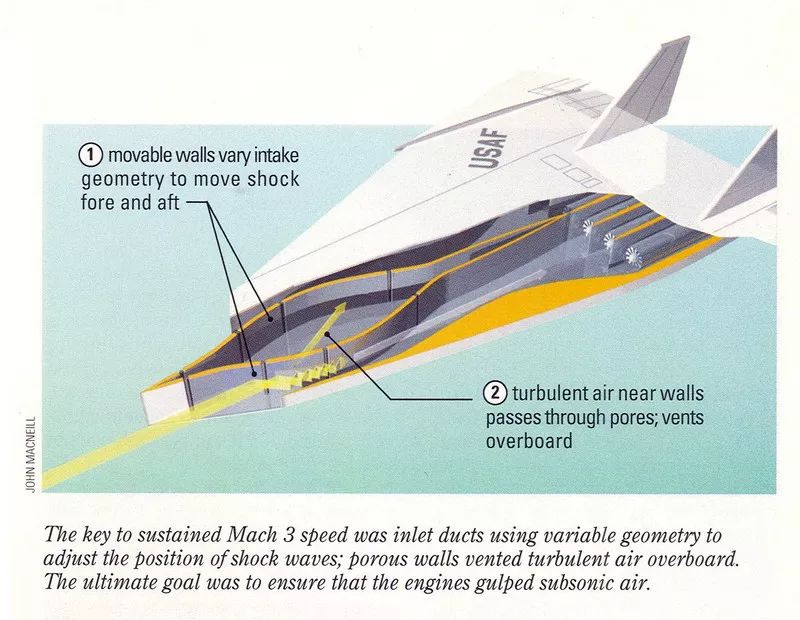 设计师花了大量时间来设计进气口内部的斜板和放气门,以便在整个预定速度范围内都能把进气减速到亚音速,为发动机提供稳定的气流。当设计使在后机身箱型结构和三角翼前端增加了修长的前机身和高置鸭翼后,就形成了XB-70独特的“愤怒眼镜蛇”外观。  三马赫速度下XB-70进气口内的复杂波系