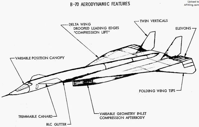 北美工程师在极短时间里就完成了XB-70的最终设计,与今日战斗机动不动就十年二十年的设计周期形成的鲜明对比。北美工程师设计出独特的可动机鼻斜坡而不是超音速客机惯用的可下倾机鼻,机鼻斜坡在超音速时升起以降低风挡倾斜角度,减小阻力。此外,该机的双全动垂尾,可下反外翼段,以及机翼后缘取代传统襟翼和副翼的五片“升降副翼”都是开创性设计。
