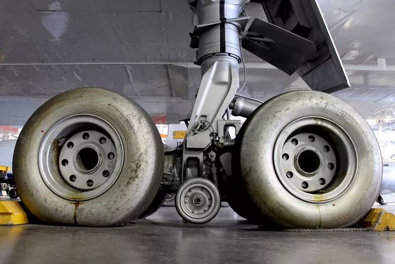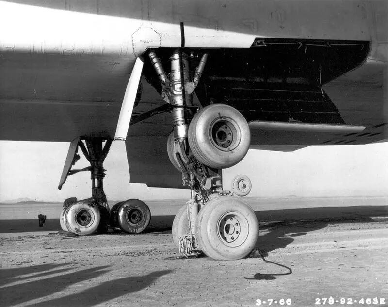 该机主起落架采用四轮小车设计,安装有耐热金属浸渍轮胎,共有41个刹车盘。不过即便刹车系统如此复杂,仍然难以应付飞机庞大的重量,在着陆中经常达到1093摄氏度的刹车温度,并导致了若干起起落架火灾。  XB-70的主起落架,也许该算五轮小车?