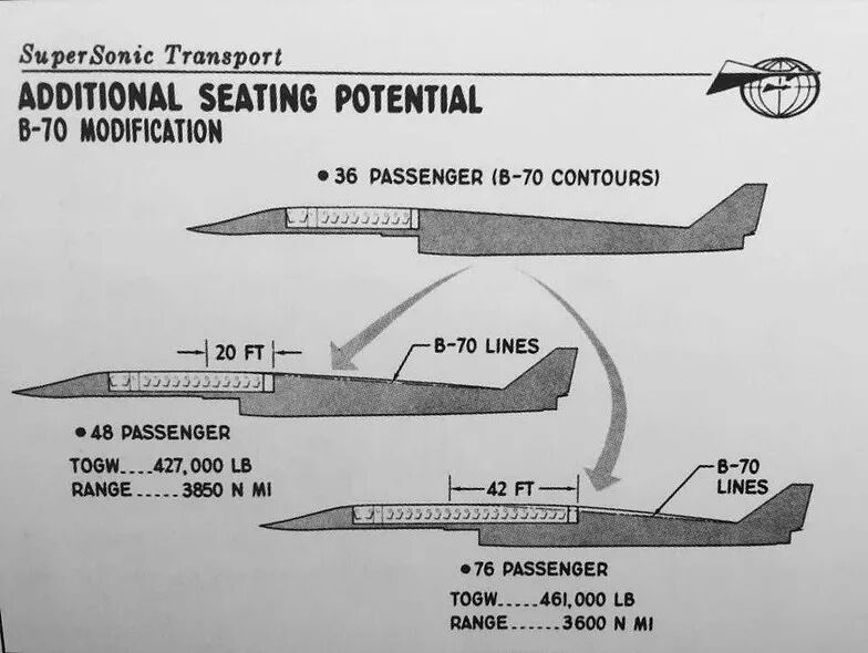 北美提出了“女武神”的各种民用改型,其中76座超音速客机,还建议把该机作为X-15火箭飞机衍生型的3马赫载机,但1969年NASA决定双双退役X-15和AV1。后者被捐赠给美国空军国家博物馆,结束了“女武神”悲壮的一生。  B-70客机