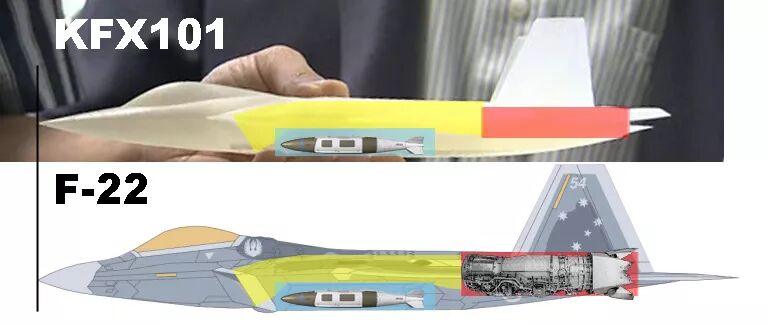 KF-X的气动外形几乎是F-22的翻版。在90年代,F-22的气动设计绝对惊艳,但二十多年后的现在就只能说还不错了。就现在发布的电脑效果图来看,KF-X气动设计水平比F-22一点都没有提高。