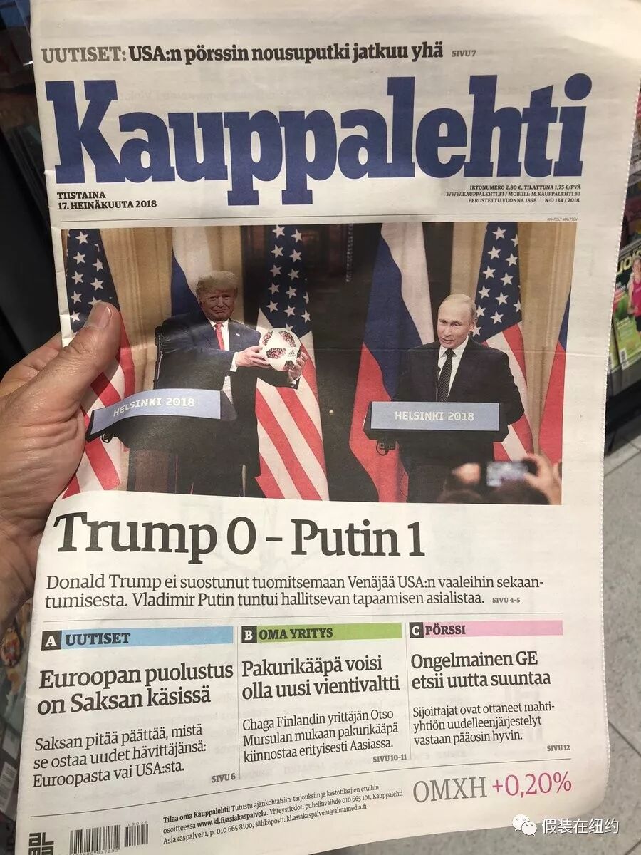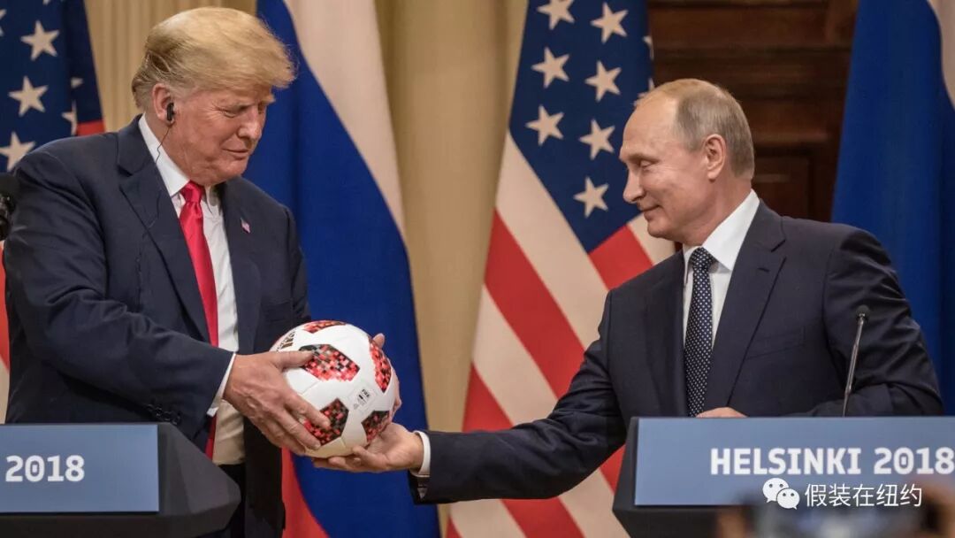 因为发布会上普京为了表示友好送给特朗普一个世界杯足球,第二天有欧洲报纸用这张照片做封面,取了一个讨巧的标题,“特朗普0:1普京”。