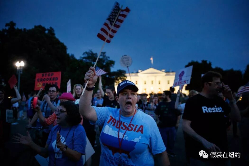 白宫外很快就出现了抗议者,注意下图姑娘的T恤,美国地图印上了俄罗斯国旗的白蓝红三横杠,Russia也变成了Trussia。