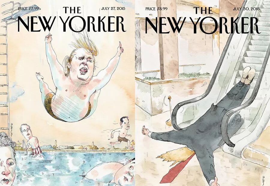 那次《纽约客》杂志同样登了一个封面,特朗普如同一个顽童从天而降跳进泳池,可以想象他肥硕的身躯即将溅起多大的水花,原本在泳池里游泳的其他政客大惊失色唯恐避之不及。