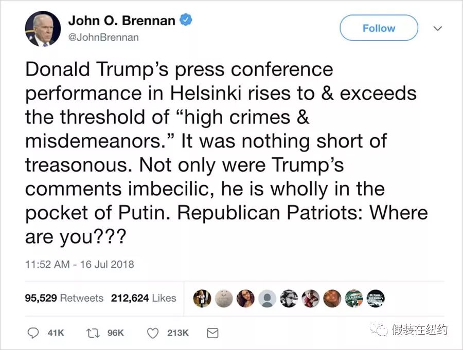 前中央情报局局长布伦南率先发推特发难:特朗普在赫尔辛基新闻发布会上的表现已经可以说是叛国罪了,不光是他的话愚蠢,他已经完全掉进了普京的口袋里。