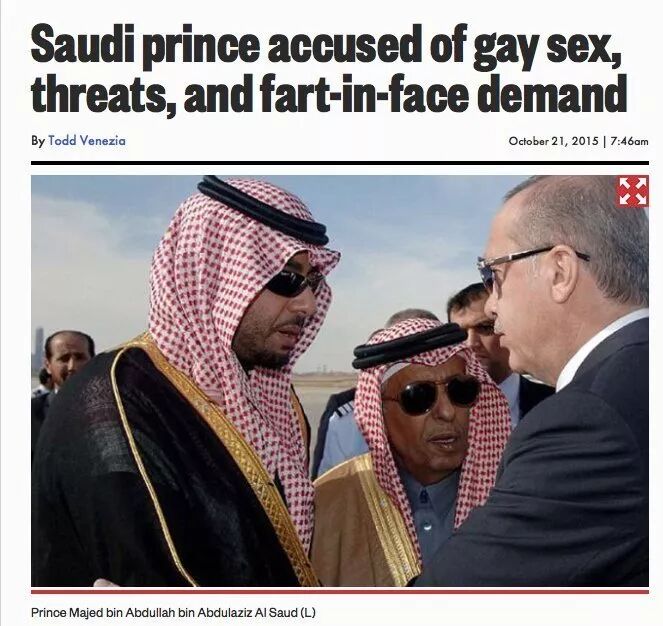 2015年,沙特王子因在美国因威胁女性被捕,他说:“我是王子,我想怎样就怎样。”。