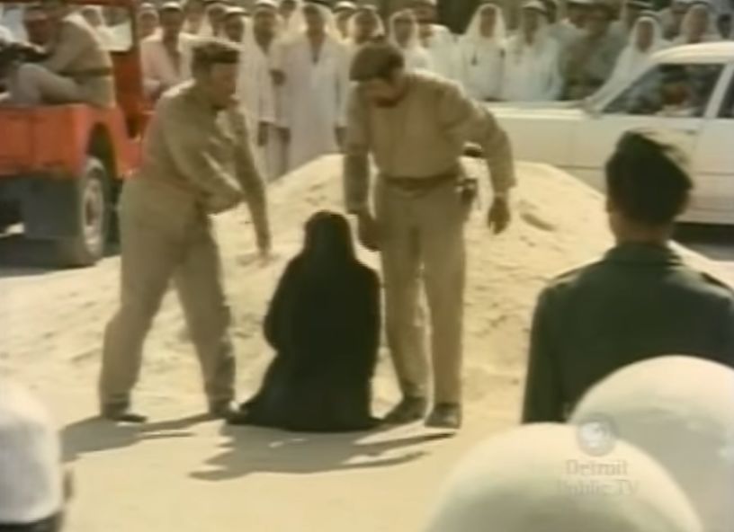 围观者们涌到了斩首广场,围观沙特王族的正义行动,看见不知名的年轻女孩在情人面前被枪杀。之后,男青年被斩首,血落一地。