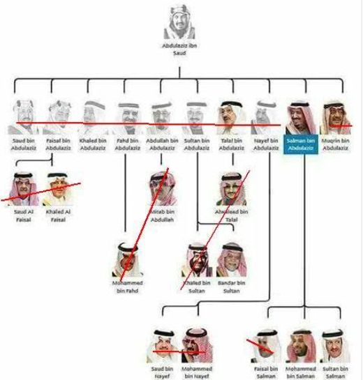 萨勒曼国王还撤销了前任国王阿卜杜拉的三个儿子,以及一个外甥的公职。被划掉的彩色头像,都是按理有资格当太子,可是被萨勒曼直接跳过的人。至此,主要障碍全部清理完毕。