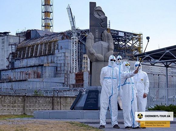 切尔诺贝利游客在反应堆外自拍。图片来源:Chernobyl-Tour