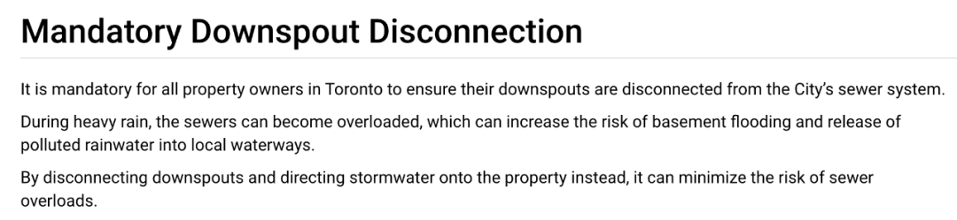 按照规定,所有物业落水管不得和多伦多市政下水道连通