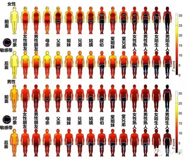 近期英国牛津大学做了一项研究统计,他们找了1500名来自世界各地的男女,并且每个人都会被13种不同关系的人触摸身体的各个部位,然后用颜色区分了男女被这些人触摸时,身体的敏感反应。
