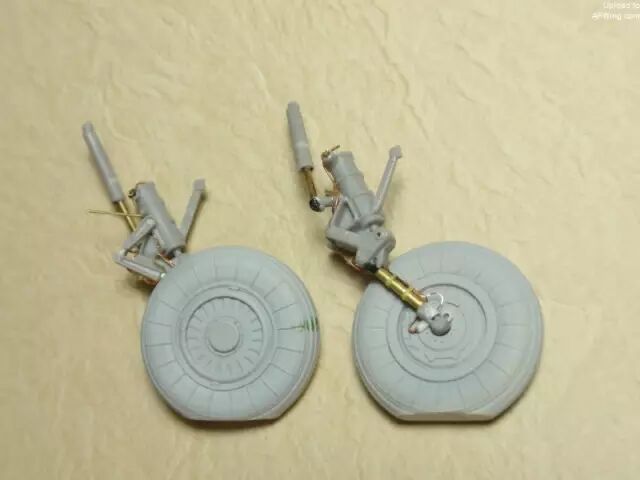 为了增加起落架的强度,液压管用铜棒代替。同时使用0.1mm和0.2mm的铜线来追加管线。机轮则是我自己制作的原型翻出的树脂件。