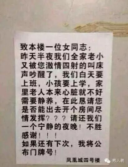 当你被工作强暴得两腿发软,回家已是深夜。即将入睡之时,耳旁传来隔壁两口子的性福战歌,他们无时无刻不在挑战你的神经和精力。苦于对方人数占有,男方甚至高你一头:没有砸门单挑的把握,你该怎么办?