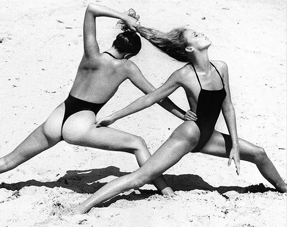 进入80年代,比基尼的风潮渐渐淡去,一件式连体泳装回潮,但是这并不是说人们对泳装的性感需求减弱了,因为即便是连体泳装,80 年代的泳装设计在剪裁上却更为大胆了,高衩至胯骨(high-cut)、深 V 至肚脐,都是 80 年代泳装的极致性感演绎。