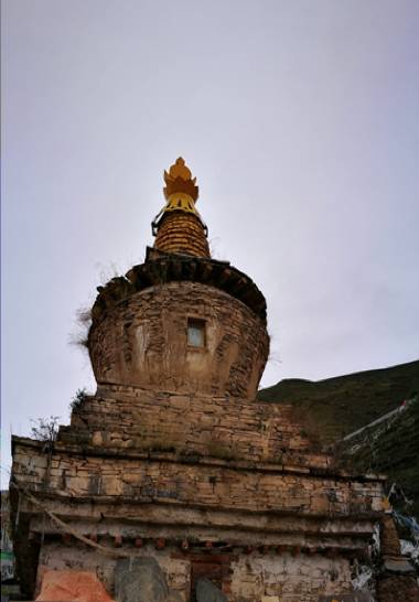 十三座一排的喇嘛塔静静矗立着,成千上万面彩色经幡高低错落地重叠,在宽广野蛮的河谷风的裹挟下,发出哗哗啦啦的巨大轰鸣,和山头下玛柯河水震耳欲聋的奔腾声合在一起。