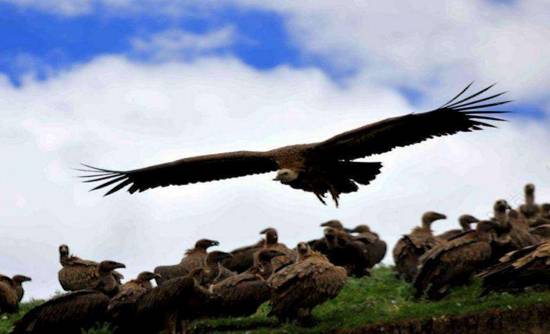 不一会,空中像有人抛洒了一大把石子似的,无数黑点朝这里聚拢而来,直到飞到眼前才看清,是一大群秃鹫。它们通体现黑褐色,眼圆而明亮,脖子细长,丑陋粗糙的红色皮肤裸露着,带钩的喙角在太阳光下发出铁般的闪亮寒光,身上的羽毛像是巨大的蓑衣把身体藏在其中,双腿矫健有力,优雅地抖着数米宽的翅膀,挟着明目张胆的杀气落在天葬台前的空地上,其中一只正好落在我身边。