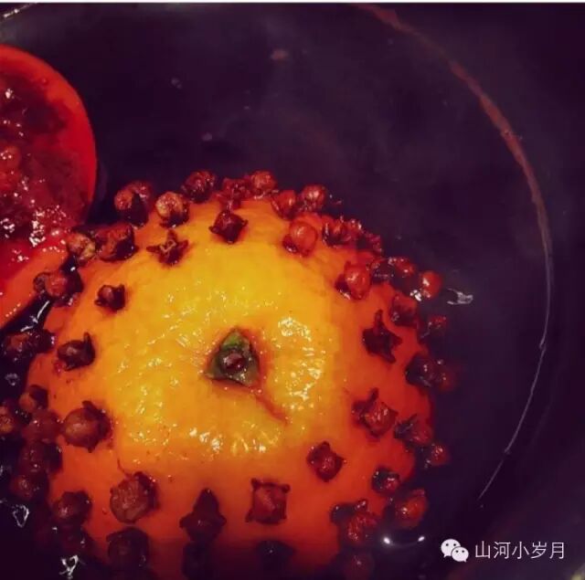我喜欢把丁香插在橙子上,有一年,我家的橙子造型是这样的: