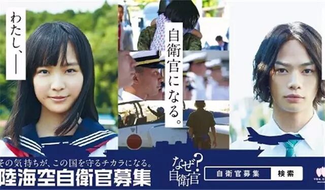 要说日本自卫队为了“拉壮丁”也确实蛮拼的,近年来,他们以极大的热情创作出各种风格的“征兵海报”。早些年即推出萌系萝莉卡通征兵广告,这可算是萌妹风格的;还可见到如黑社会形象般的猛汉三人组自卫队代言广告,那似乎就有点像是黑社会的“筋肉兄贵型”风格了;前两年又请出AKB48的人气明星岛崎遥香和女星平野绫在海报上搔首弄姿、制作美女明星挂历等等,这则是打青春偶像牌了,当然,自卫队招兵买马的广告片是也不可能少了水手服美少女们参与制作的。