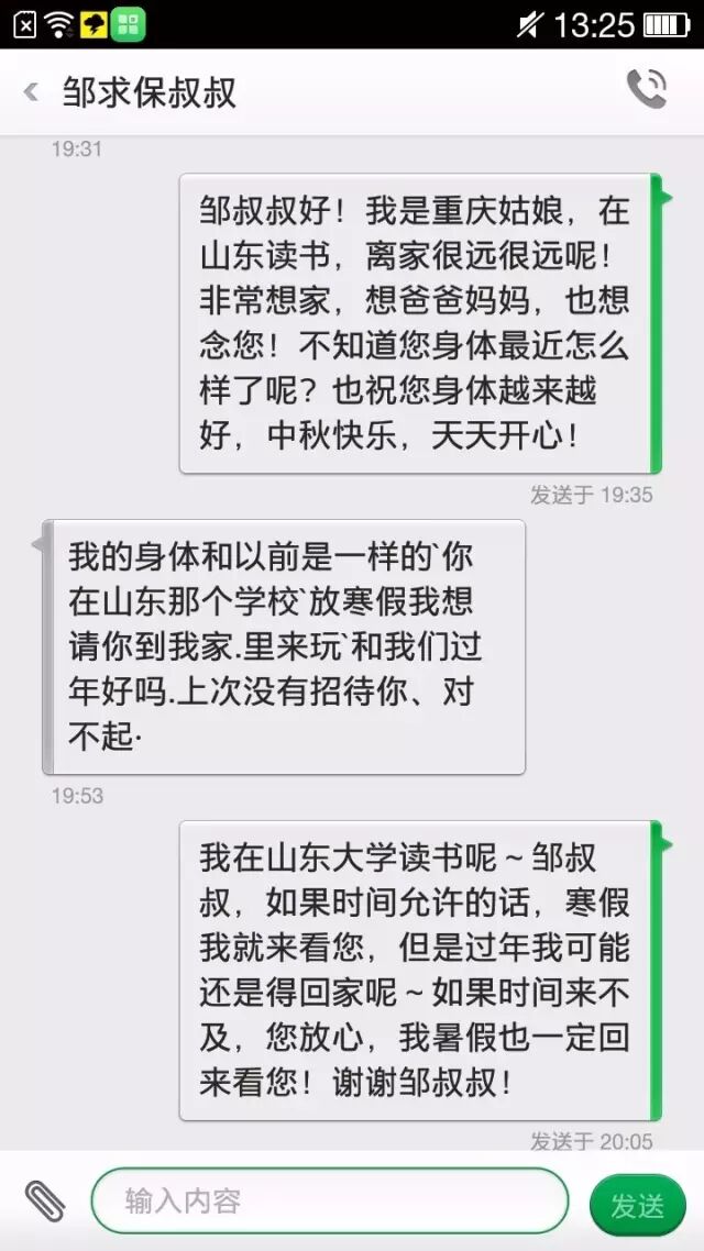 我一个字一个字地写下,“邹叔叔好!我是重庆姑娘,在山东读书,离家很远很远呢!非常想家,想爸爸妈妈,也非常想念您!不知道您身体最近怎么样了呢?也祝您身体越来越好,中秋快乐,天天开心!”