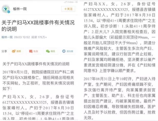 2017年8月31日,榆林市第一医院绥德院区妇产科里,产妇马女士跳楼身亡。