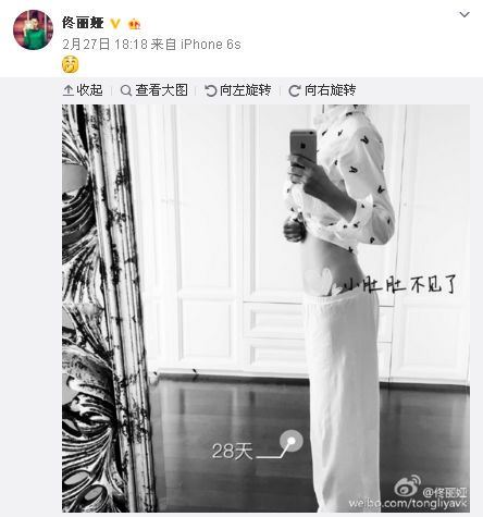 ▲佟丽娅产后晒出照片,并配文:“28天,小肚肚不见了”