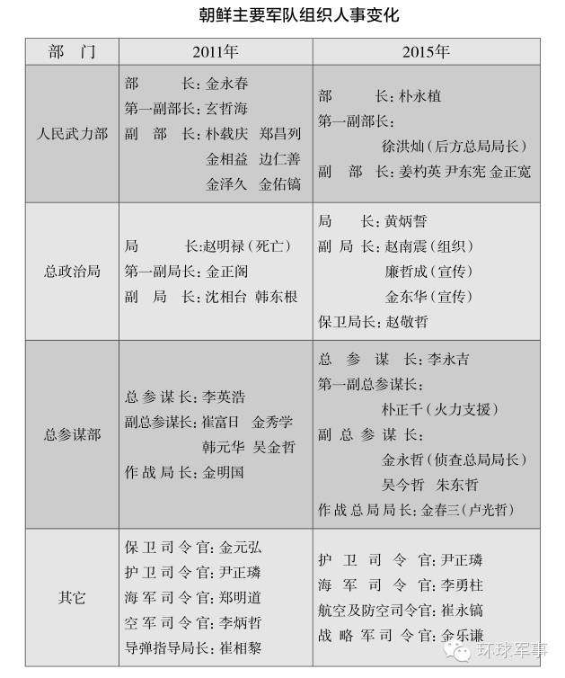 交替最频的军部首脑层 金正恩执政以来,朝鲜人民军总政治局局长从金正阁到崔龙海再到黄炳誓更换了3次,人民武力部部长历经金永春、金正阁、金格植、张正男、玄永哲、朴永植更换了6次,总参谋长历经李英浩、玄永哲、金格植、李永吉更换了4次,作战局长历经金明国、崔富日、李永吉、边仁善、金春三更换了5次。最近也有传言说金春三被解除职务,卢光哲第一副总参谋长调任了作战局长。此外,第一副部长兼后方总局局长也更换了3次,分别是玄哲海、全昌福、徐洪灿。最近,保卫司令部改编为总政治局下辖的保卫局,其局长金元弘被替换为赵敬哲。