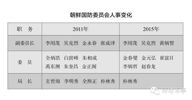 全员更替的国防委员会 朝鲜国防委员会也经历了巨大的调整。2011年,朝鲜国防委员会还是4名副委员长和6名委员。但现在只有李用茂、吴克烈两名副委员长留任,黄炳誓晋升为副委员长,其余委员则全员被交替,空缺由金春燮、金元弘、崔富日、赵春龙、李炳哲所代替。局长级别中朴林秀被确认,另有2014年11月被降职下放的国防委设计局局长马元春,于2015年10月回到了原职。