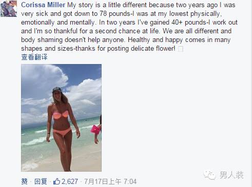 大概意思是“我知道你是花花公子的模特,身材很牛逼,但身材普通的人也不该成为被嘲笑的对象。我身材很平凡,但老娘活得很爽。”