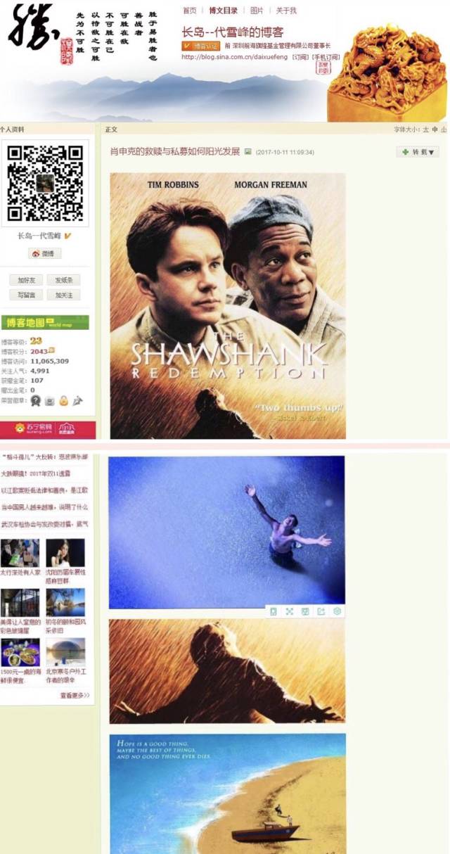 《肖申克的救赎和阳光私募如何发展》是代雪峰在2017年10月11日更新的最后一篇博客,除九张剧照外,再无其他文字,记录了从电影海报到陷入囚笼,再到最后肖申克与瑞德在海滩重逢的最后一个远景镜头。