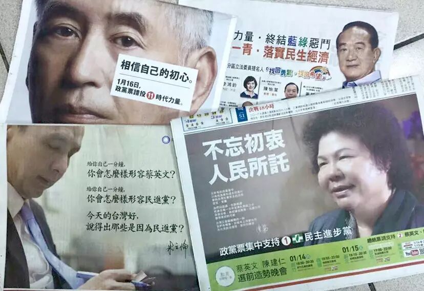 距离分晓结果不到30个小时,最简单直观地去总结整场选举中各党带给台湾人的观感,其实看看昨天台湾各大报纸头版广告就一目了然。民进党的广告主打“不忘初衷 人民所托”,配以大幅陈菊照片,先简明扼要唤出党外时代受难的民主遗产,再强调这些年的自我反省,稳扎稳打宣传自身的积累。“时代力量”则是简简单单,只有“相信自己的初心”这七只字,广告的主人公是从电影界转入政治参与的不分区“立委”柯一正导演。没有任何多余字句——相信就相信,如果有好感就去投票,民主政治本来就这么简单清爽。至于像“中华统一促进党”这种听名字就知道是主张“和平统一”的小党,广告上就密密麻麻写了满篇主张,把平时大家肯定没耐心看的话一股脑讲完,中心思想归为“绿营不行、蓝营不行、只有我们正红旗最行”。