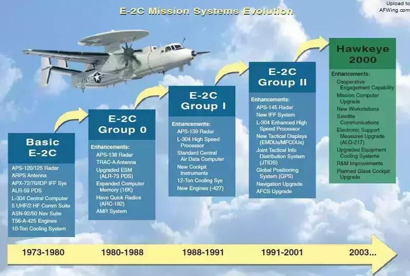 1978年美国海军启动E-2C性能升级项目,将55架基本型E-2C改装到Group 0标准,安装洛克希德·马丁公司(Lockheed Martin)的APS-138雷达。此后生产E-2C为Group I的标准,于1989年开始服役,机上安装的是3800千瓦的T56-427A发动机和洛克希德·马丁公司的APS-139雷达。1991年E-2C的生产标准升级到Group II,安装洛克希德·马丁公司的APS-145雷达,此外还有联合战术信息分发系统、无线电、彩色显示器以及一部全球定位系统(GPS)接收机。第170架E-2C在1994年出厂,格鲁曼位于纽约州的生产线随之关闭,迁移到佛罗里达州。